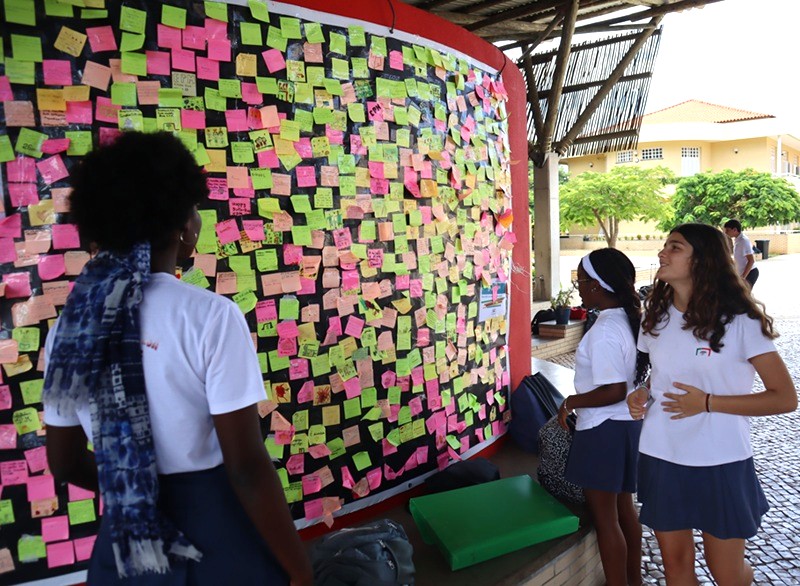 O mural cresceu como crescem as coisas vivas, em camadas, cores e caligrafias diferentes. Papéis verdes, rosas, amarelos e laranja cobrem a parede com frases curtas, desenhos, corações, estrelas, desejos e agradecimentos. Há mensagens que falam de felicidade, outras de aprendizagem, algumas de sonhos ainda por cumprir.